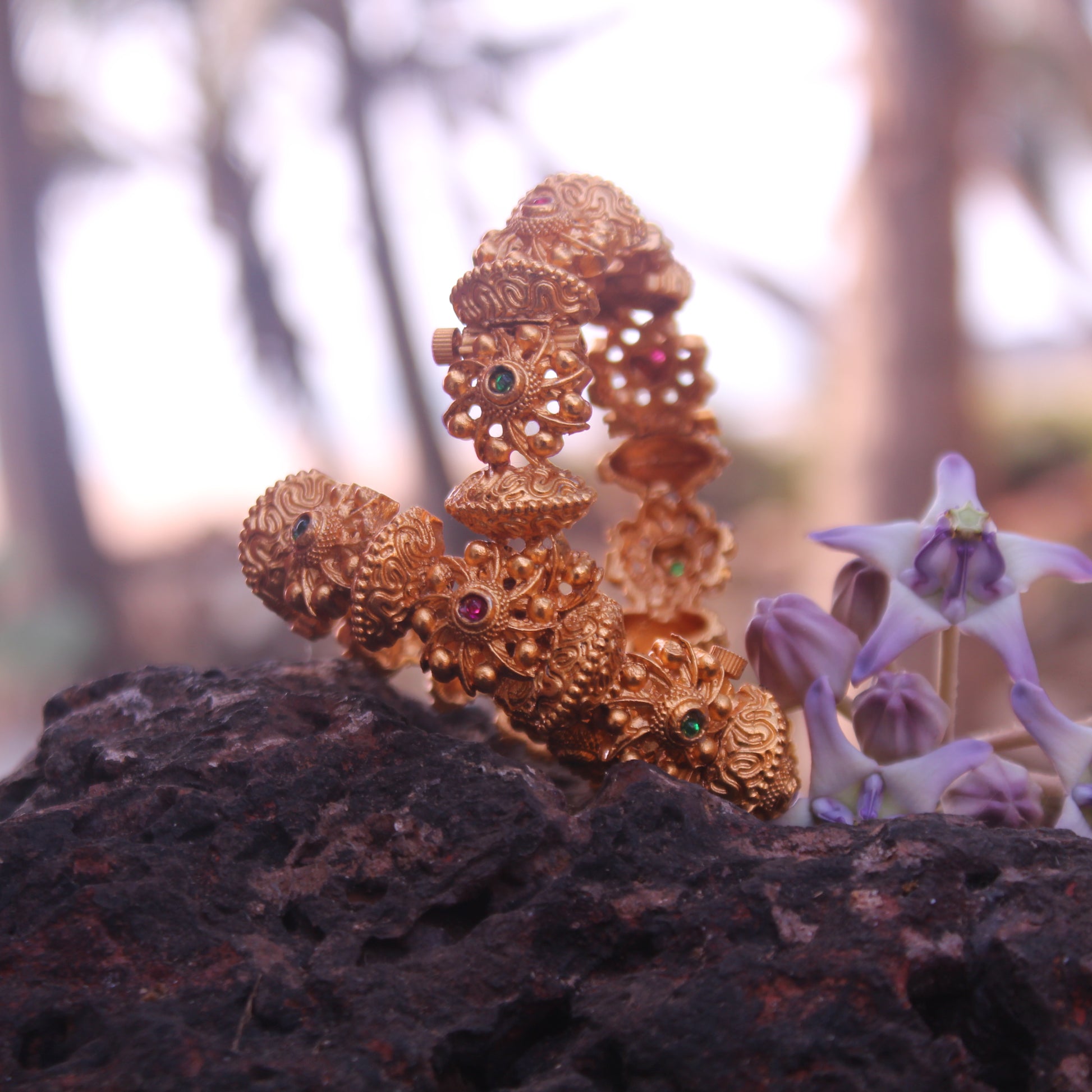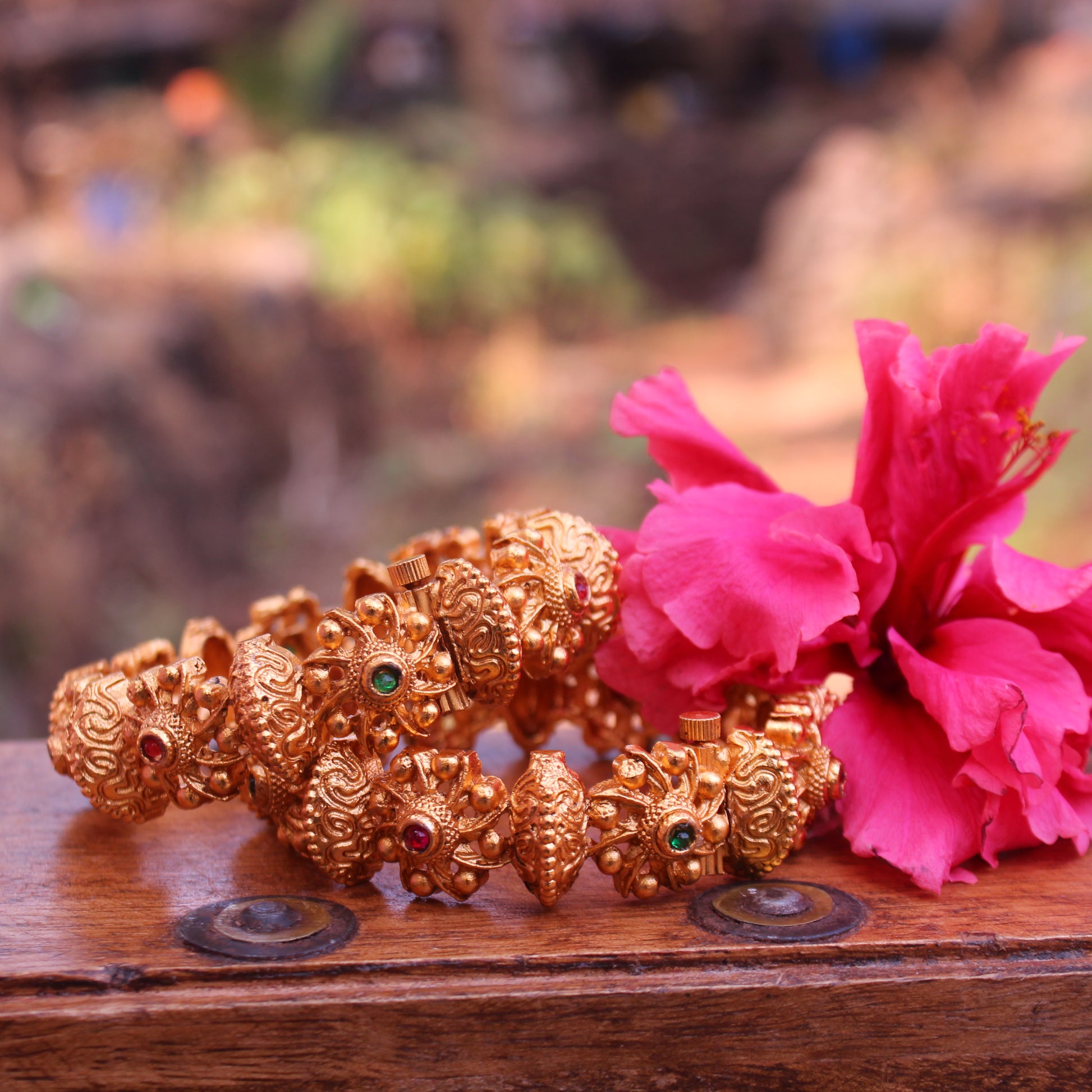 Immerse yourself in timeless elegance with these stunning antique-finish kada bangles, inspired by traditional South Indian temple jewelry. Crafted with intricate floral and deity motifs, each bangle showcases exquisite detailing and is adorned with vibrant red and green stones, adding a regal charm. The rich gold tone and bold, sculpted design make them perfect for festive occasions, weddings, and traditional celebrations.