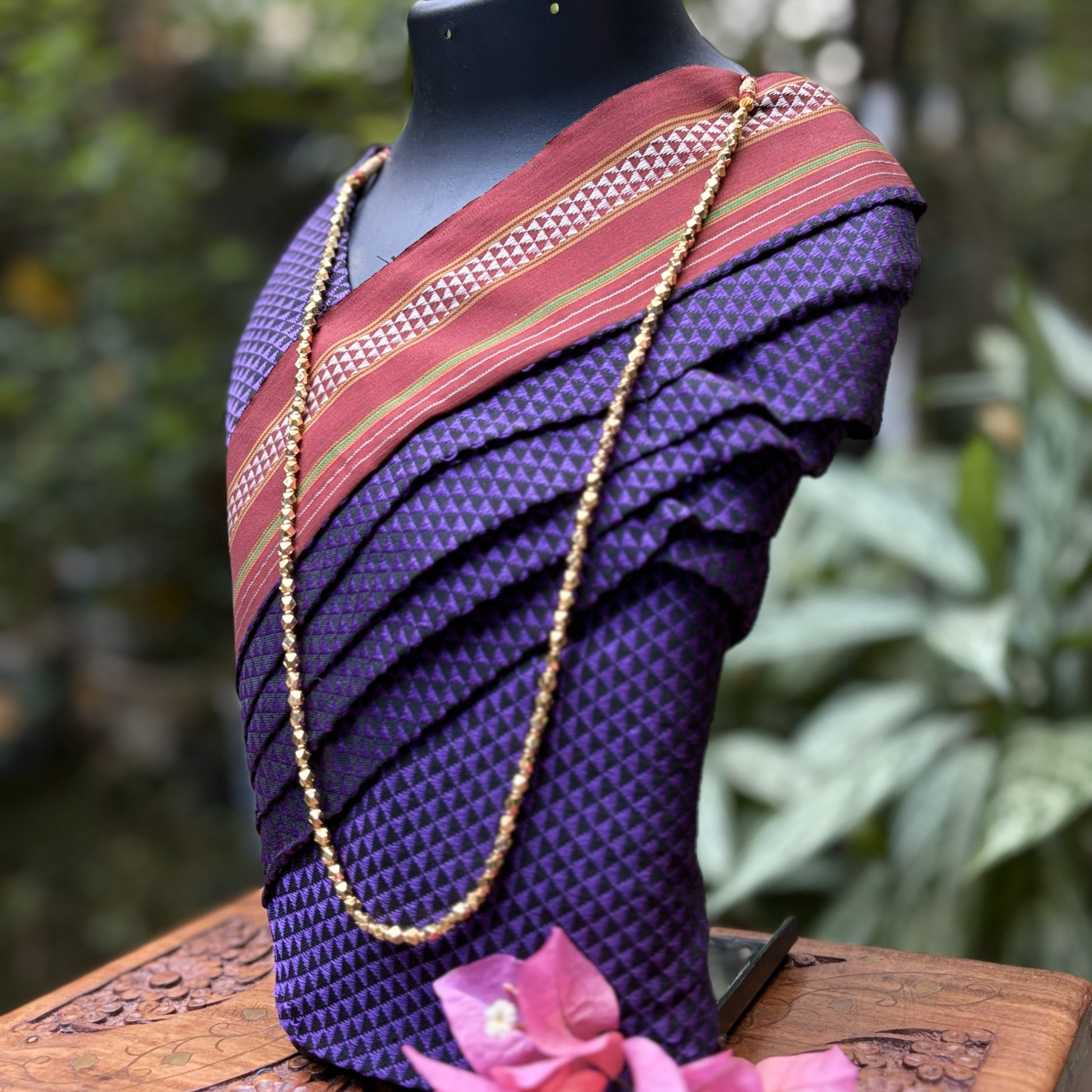 These finely crafted beads are strung together in graceful layers, creating a rich, rhythmic flow that sits beautifully on the neckline. The structured yet elegant form gives the necklace a royal presence, making it ideal for traditional sarees, Nauvari drapes, and festive attire.