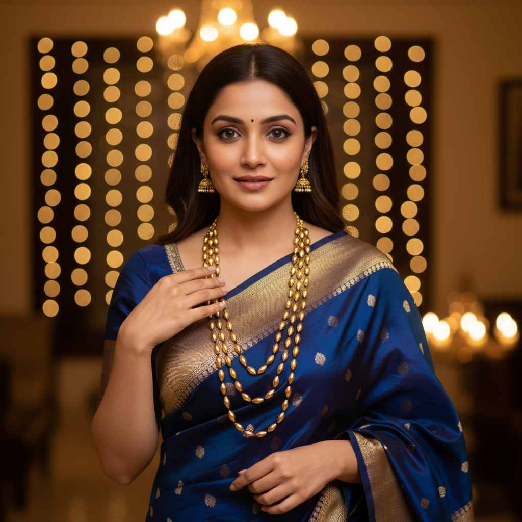 Product Description : Bormaal is a traditional piece of jewelry in India, especially in Maharashtra. It is a necklace made of small beads shaped like bor (jujube fruit). Along with round, smooth beads, Bormaals are also crafted using elongated rectangular beads. These beads are made by shaping thin metal sheets and filling them with lac ( wax like substance), creating a piece that is lightweight yet has a striking appearance. In the past, people used to wear single-layered Bormaals, but now double-layered and triple-layered versions have become quite popular.
