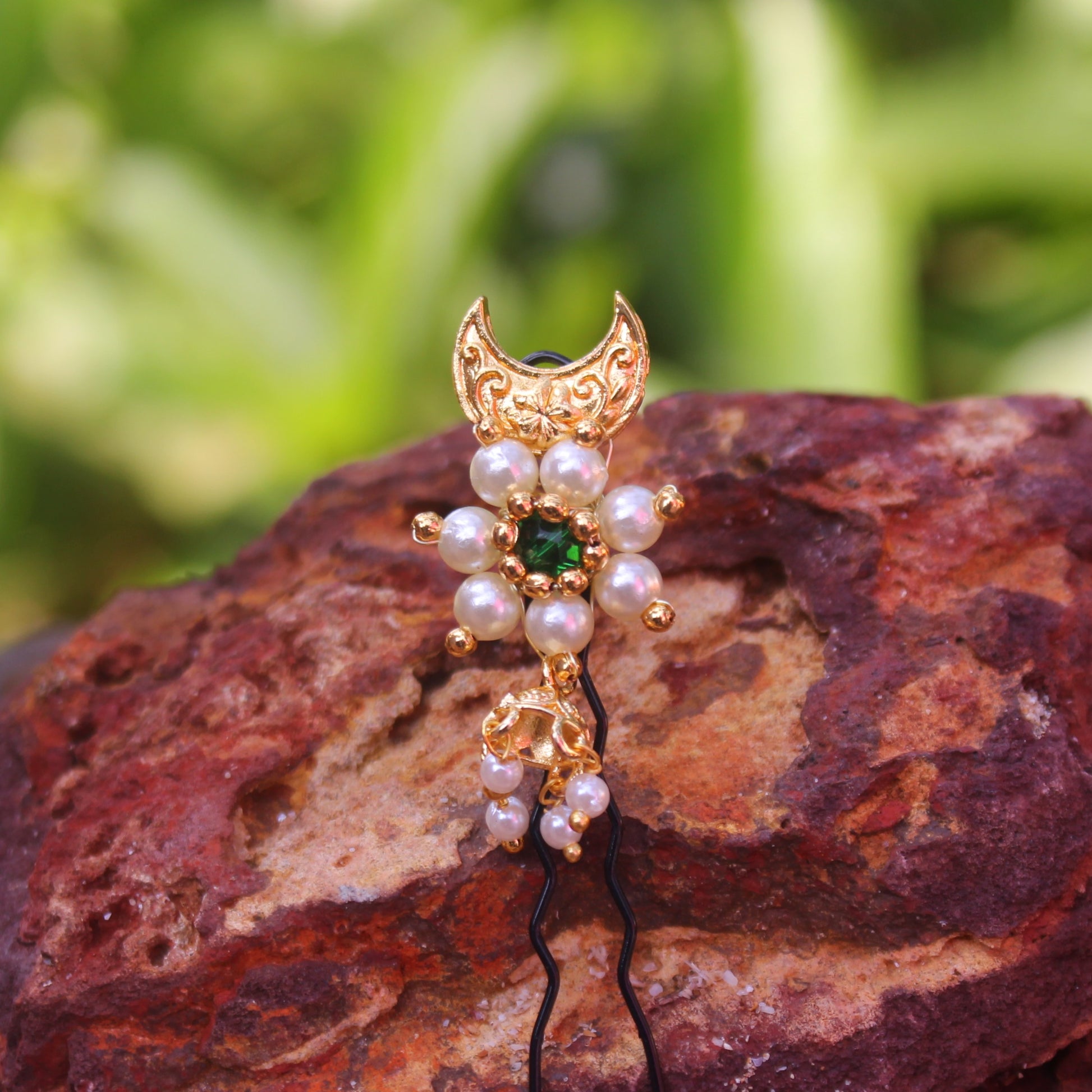 Elevate your hairstyle with this Handmade Kata (Hair Pin), a beautiful blend of tradition and elegance. Featuring a crescent moon design at the top, adorned with pearls and a central ruby-red or green crystal bead, this hairpin is handcrafted with precision to give your bun a graceful look. The delicate jhumka detail and hanging pearls add a touch of sophistication, making it perfect for festive or bridal occasions.