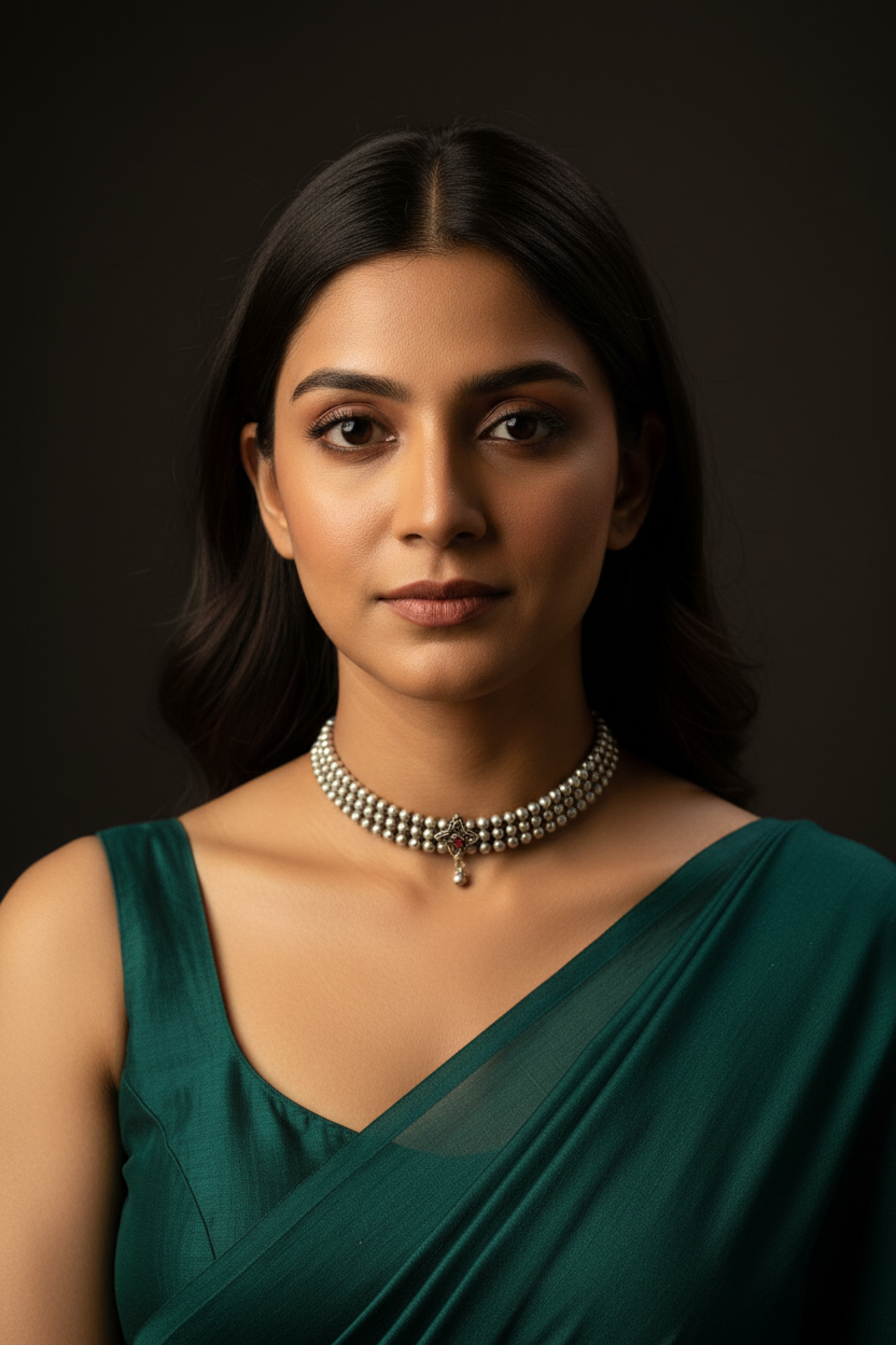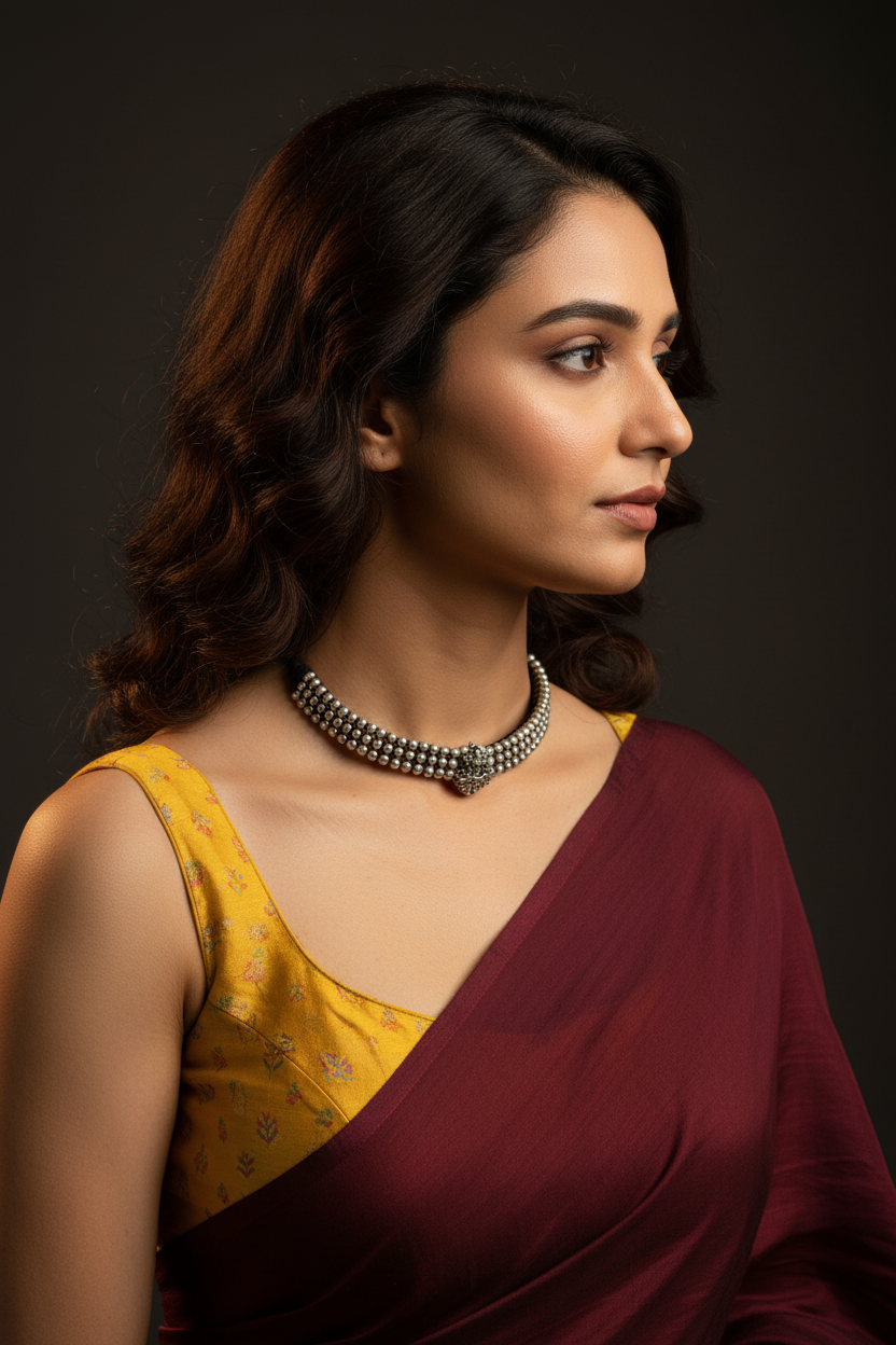 Choker looks beautiful when worn in traditional border style saree or also without border saree. It can be also worn with a Ethnic Salwar Kurta.