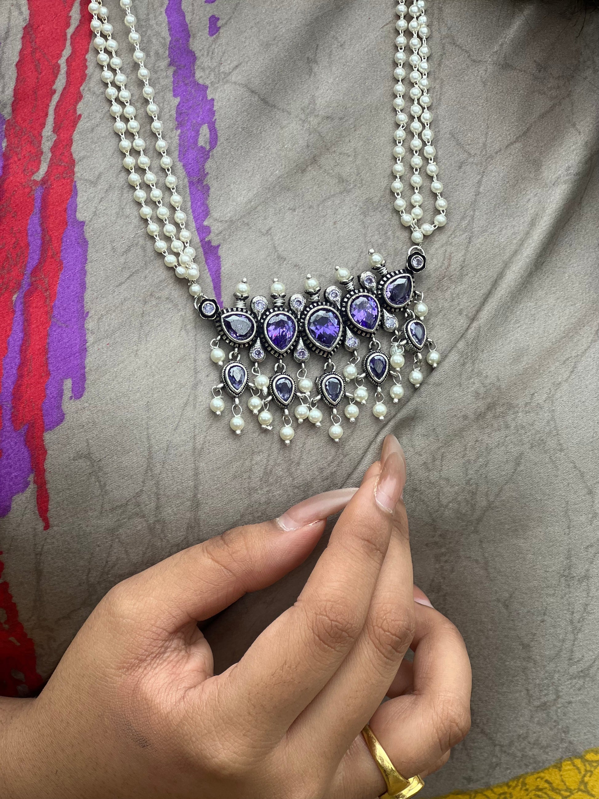 5 Stones Puneri Khod Tanmani With Triple Layered Moti Chain.