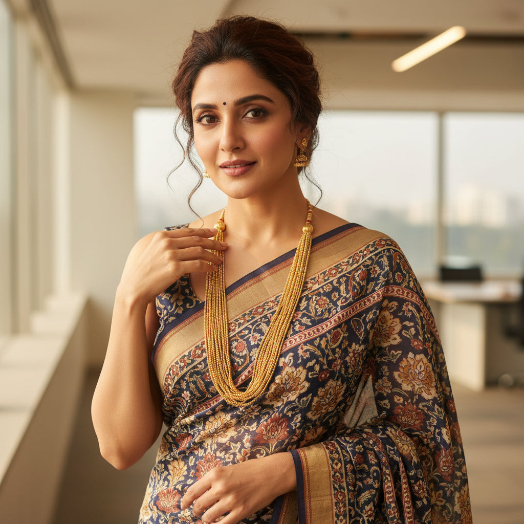 The Jondhalemani beads resemble the shape of sorghum seeds. Tiny gold beads crafted to mimic the appearance of jowar grains are intricately woven together to create a necklace known as the Jondhalemani Poth.