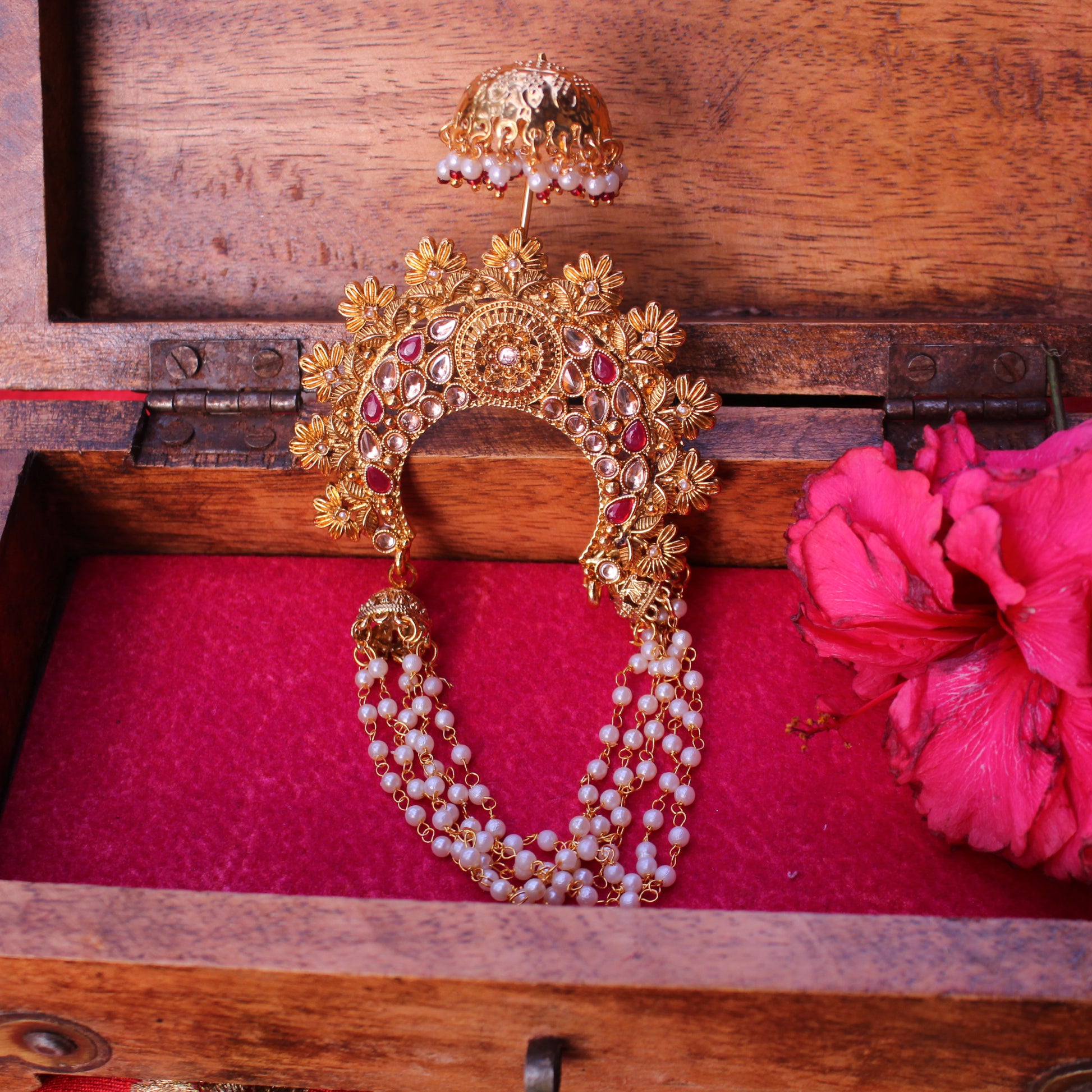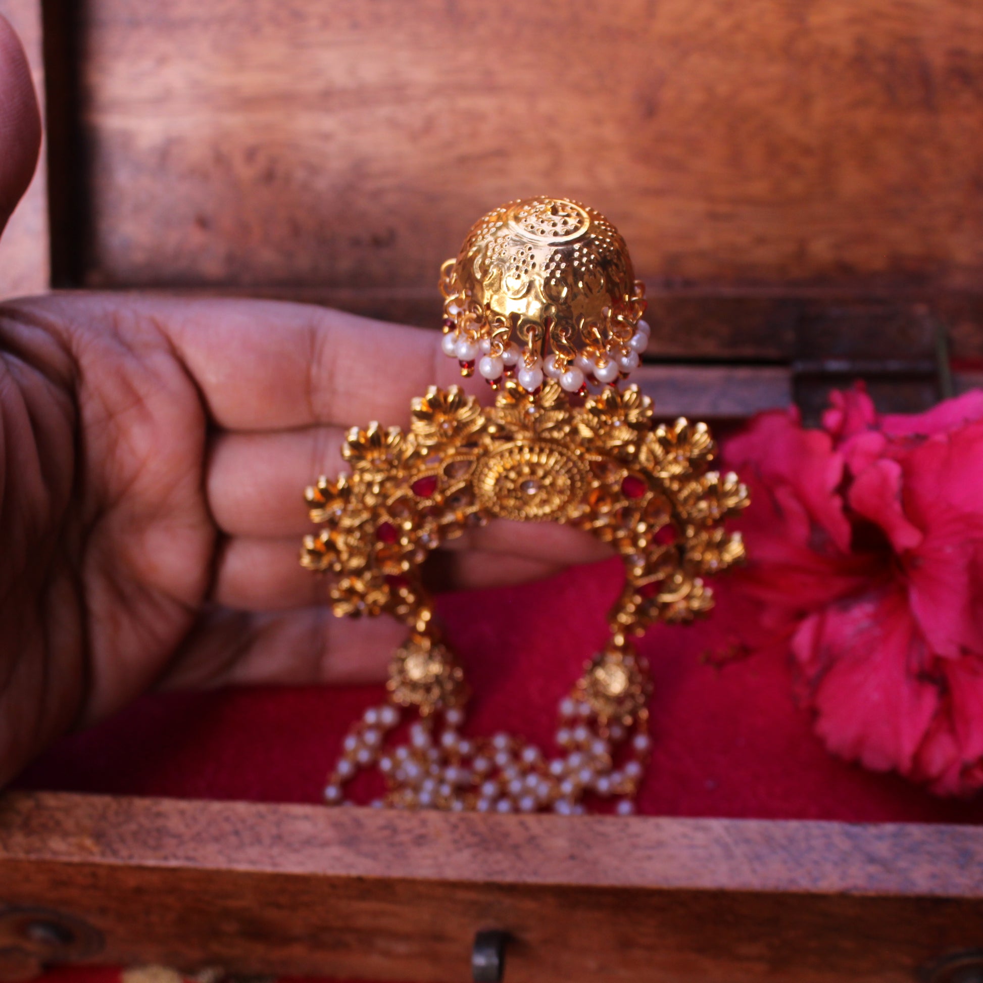 Enhance your traditional hairstyle with this exquisite ambada kata featuring a beautifully crafted Chatri design. Designed to adorn your hair bun, it is intricately studded with vibrant red and green stones, the semi-circular frame add a touch of grace to your look. Perfect for weddings, festivals, and traditional events, this timeless piece brings out the essence of Maharashtrian culture. Add this stunning ambada kata to your collection and make every occasion special.