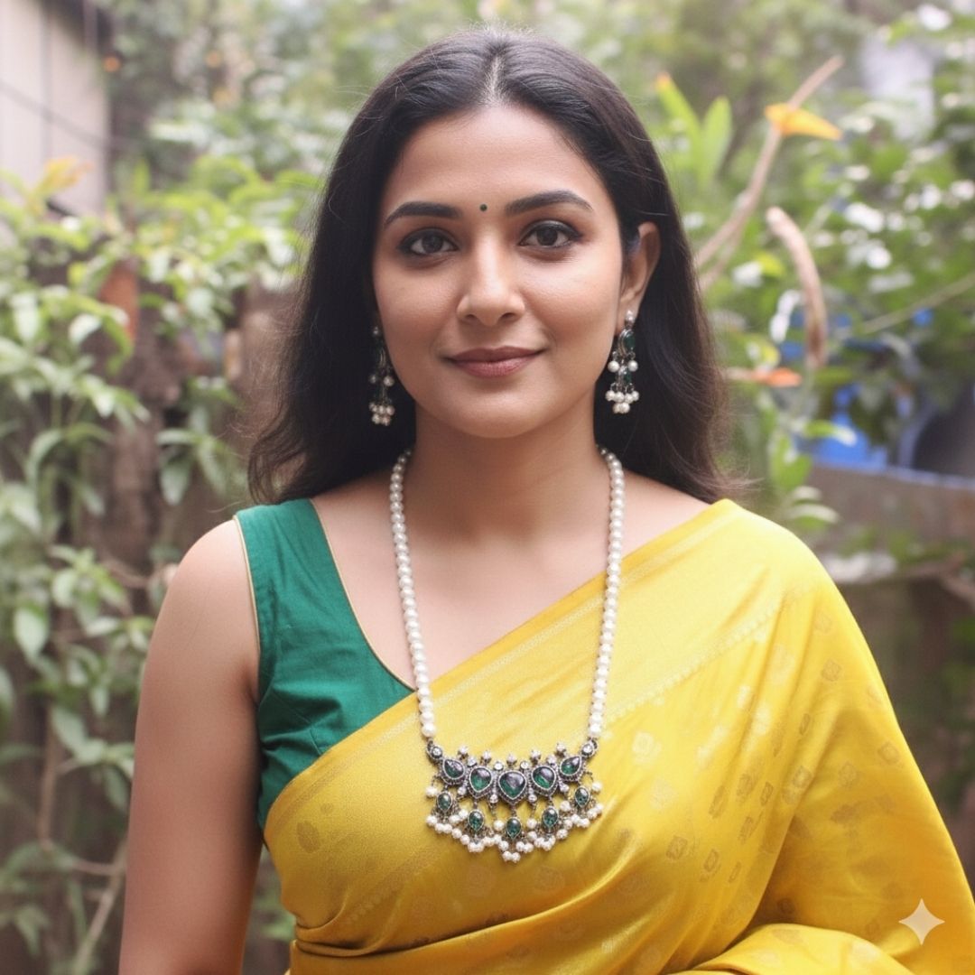 Tanmani looks beautiful when worn in traditional border style saree or also without border saree. It can be also worn with a Ethnic Salwar Kurta.